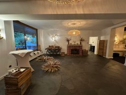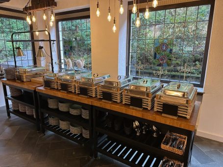Der gemütliche Essenssaal bietet Platz für unsere Gäste. Durch einen großen Eingangsbereich, welcher später am Abend zur Tanzfläche wird, kommt man in den Büffetraum. Dort gibt es eine Theke für die Getränkeausgabe und zwei große Tische für die Essensausgabe. Es sind zu jeder Zeit Service Kräfte für euch im Einsatz.
